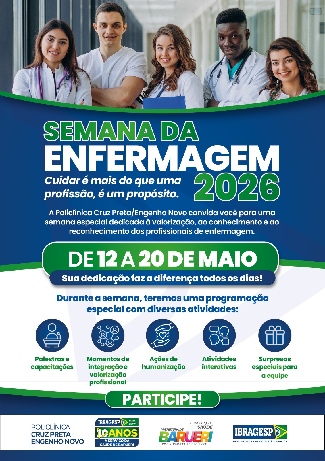 A Policlínica Cruz Preta/Engenho Novo, gerida pelo IBRAGESP – Instituto Brasil de Gestão Pública, promove entre os dias 12 e 20 de maio a Semana da Enfermagem 2026, com uma programação dedicada à valorização, capacitação e integração dos profissionais que atuam na unidade.